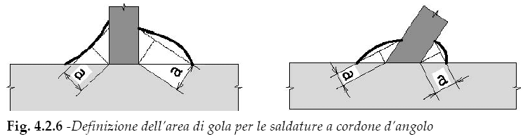 La resistenza di progetto, per unità di lunghezza, dei cordoni d’angolo si determina con riferimento all’altezza di gola “a”, cioè all’altezza “a” del triangolo iscritto nella sezione trasversale del cordone stesso (Fig. 4.2.6).