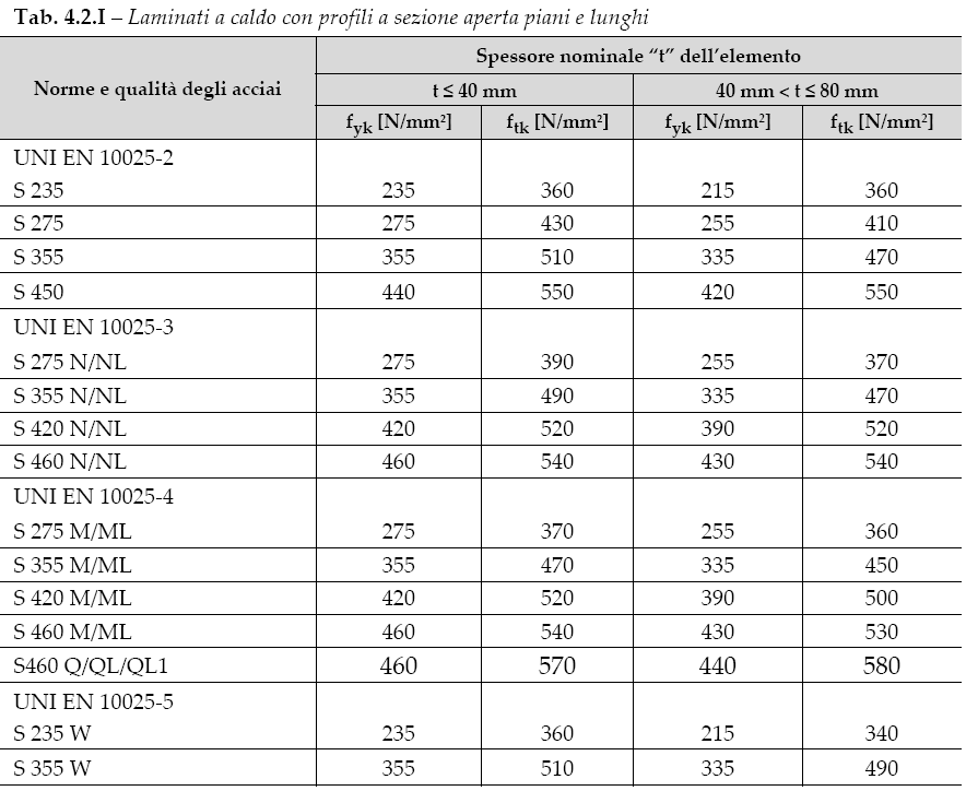 In sede di progettazione, per gli acciai di cui alle norme europee armonizzate UNI EN 10025-1, UNI EN 10210-1 ed UNI EN 10219-1, si possono assumere nei calcoli i valori nominali delle tensioni caratteristiche di snervamento fyk e di rottura ftk riportati nelle tabelle seguenti.