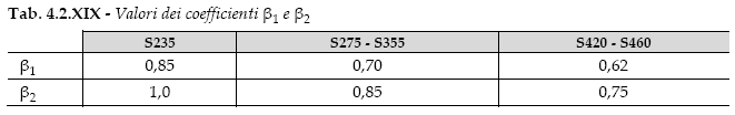- beta; = 0,80 per acciaio S235; 0,85 per acciaio S275; 0,90 per acciaio S355; 1,00 per acciaio S420 e S460.