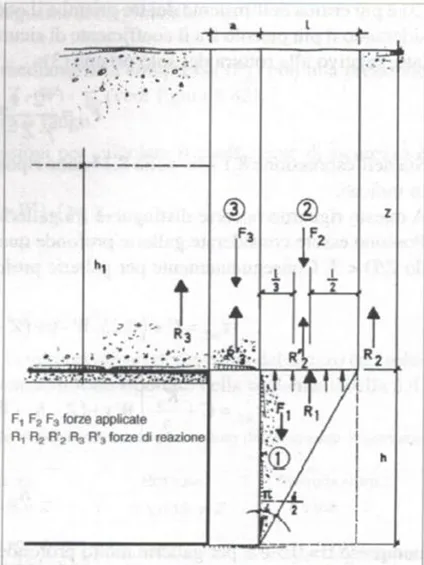- Silo: un prisma verticale sopra il cuneo che grava su di esso, ma è parzialmente sostenuto dall’attrito laterale con il terreno circostante (effetto silo).